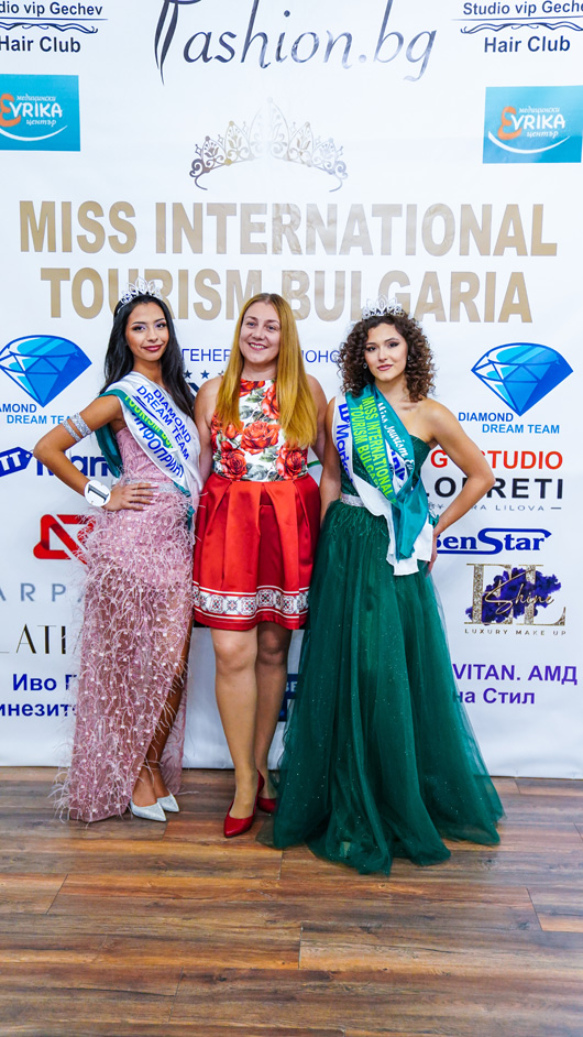 Водещата Ивелина Иванова, Божил Николов - организатор на конкурса, Галена Назърова, Miss International Tourism Bulgaria 2025